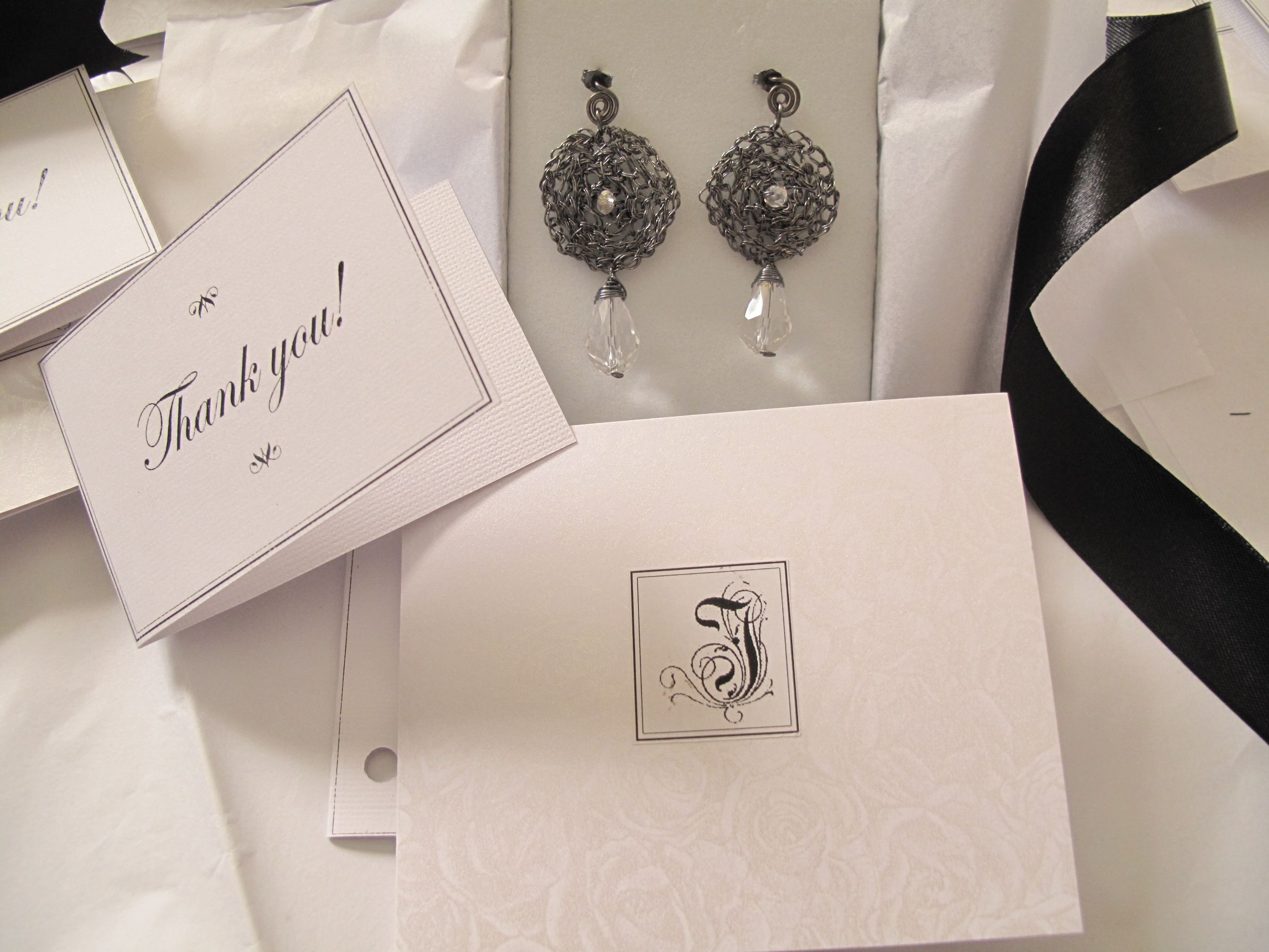 The ladies’ earrings were easier to make.  The bride saw a previous filigree design and decided on it right away.  It used blackened sterling silver, Austrian crystals and quartz.  To make theirs more unique, I made them larger and used rock crystal quartz and larger briolettes.  I thought that would be enough for the earrings to stand out even under their fascinators.