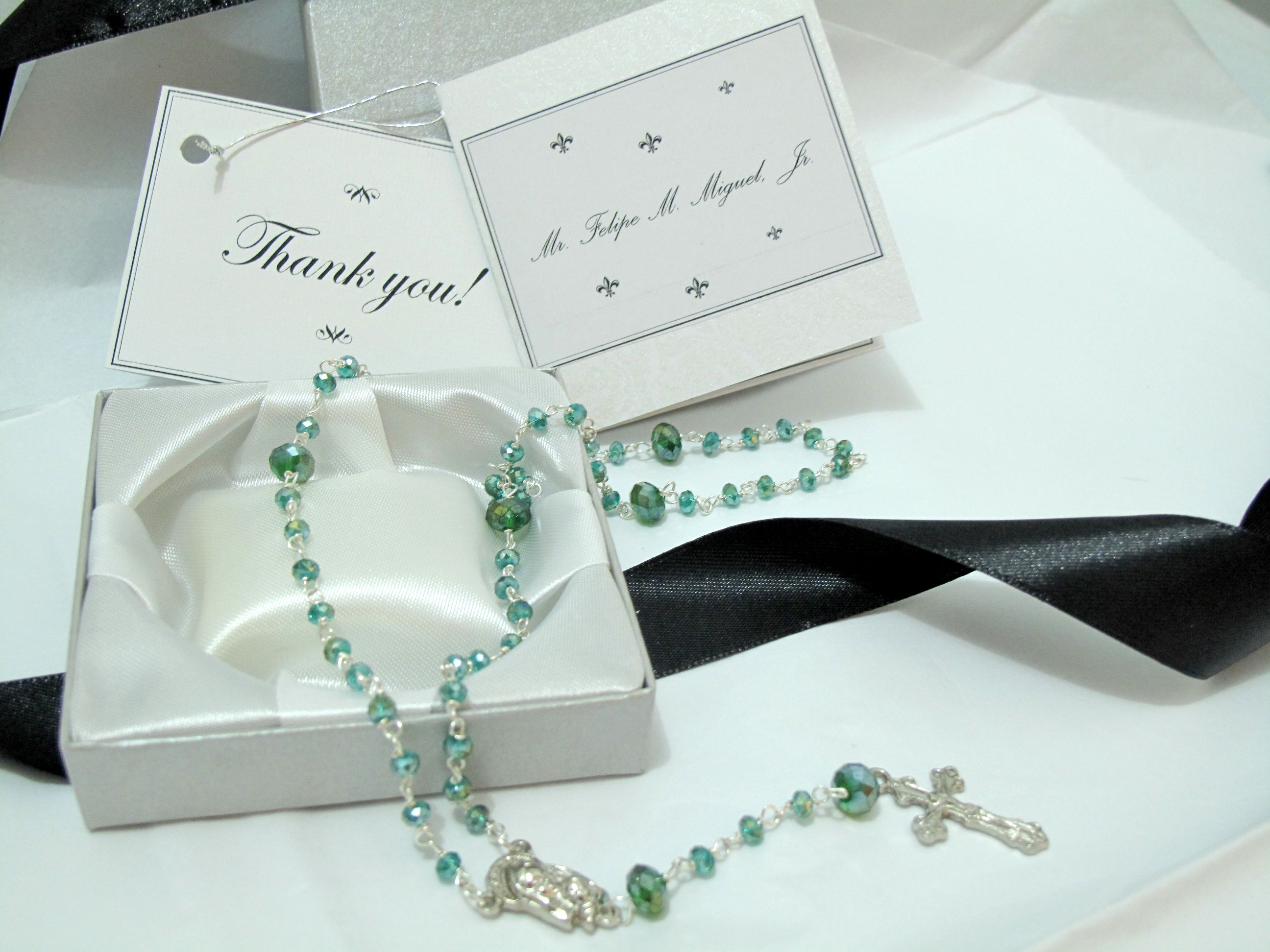 The couple wanted this personalized and how much more personal can you get with birthstones! They decided on full length rosaries with beads made of the sponsors’ own birthstone 🙂 Real and natural gemstones were quite pricey a year ago and their prices have not gone much lower.  To stay within budget, I used Austrian crystals and wrapped them together with plated sterling silver components.  It will not be much noticed but this made them coordinate well with the wedding cord.