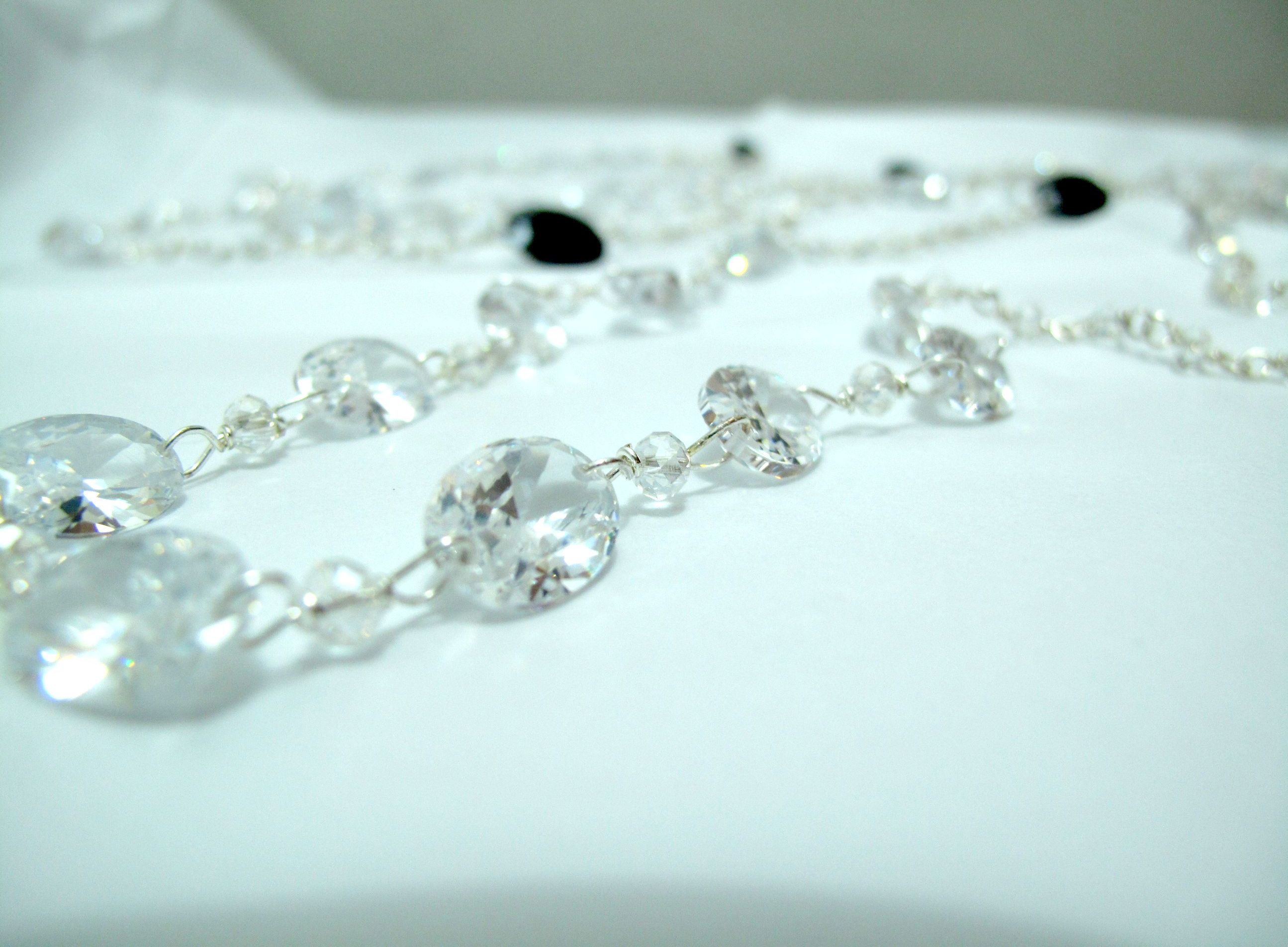 The ClassicSparklers’ filigree technique was fully used on this piece.  All sterling silver where diamond Swarovski faceted bicones were scattered about for that added shine.  For that diamond stud, I used faceted Austrian crystals.  For the smaller danglers I used sterling silver bezel set cubic zircons.