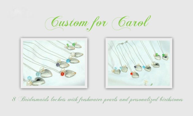 The request: 8 silver-filled engraved filigree heart lockets customized with freshwater pearls and birthstone Austrian crystals for the bridesmaids.