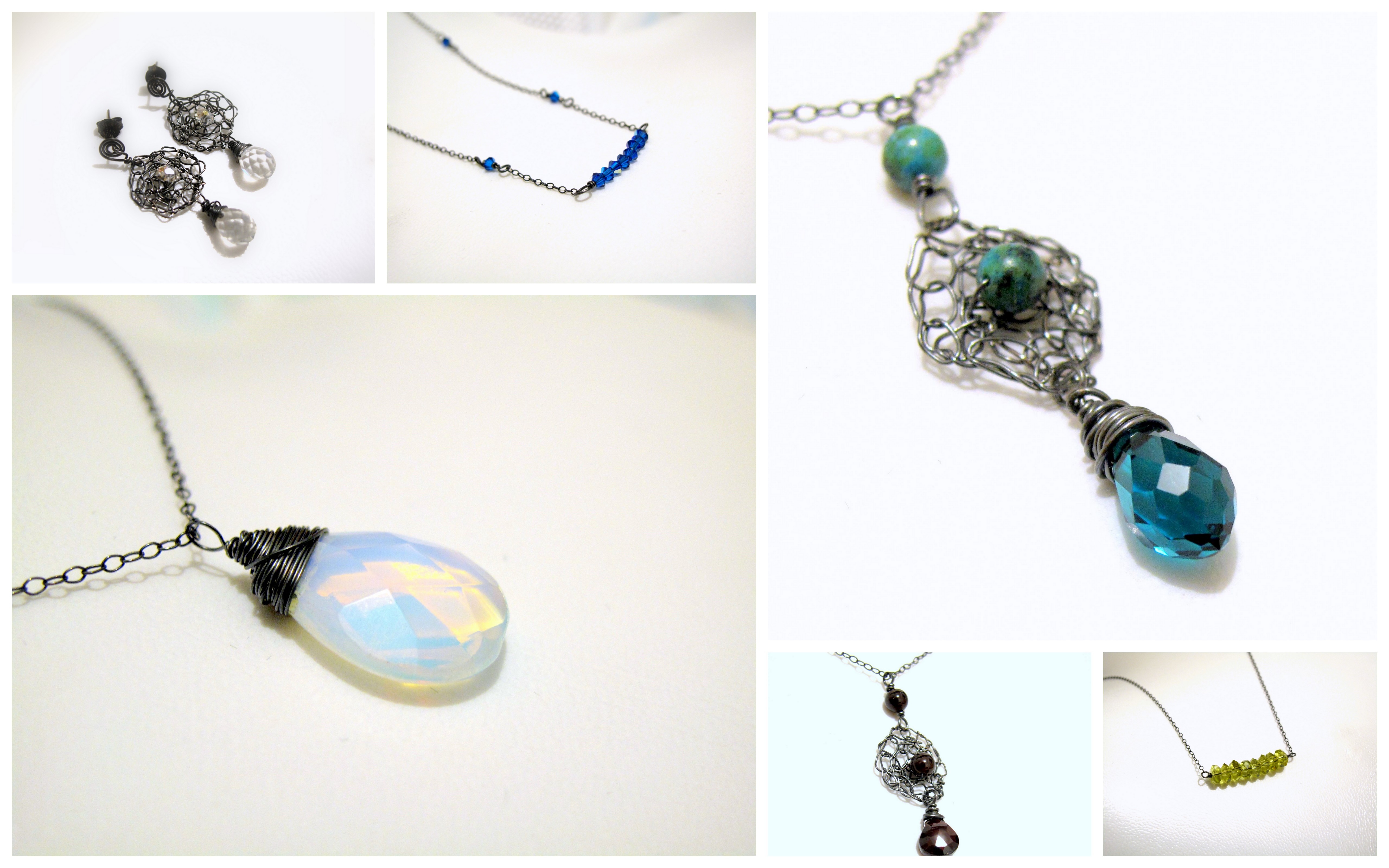 Wear it with your business suit, your casual outfit, or even your evening dress.  Pair it with a collared top and jeans during dress down days.  The versatility of the necklaces are enhanced by their unique designs.  Subtle but creative.  Semi precious gemstones, South Sea shell pearls, freshwater pearls, faceted Austrian crystals and more wire wrapped in 14k gold filled (rolled gold).  They hang from dainty chains that glimmer as they “disappear” into your skin.  A little twist and a little turn here or there, wait for the chain to catch the light and give out that sparkle.