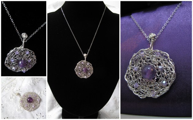 The request: an amethyst bead in the middle of my signature design crocheted disc.