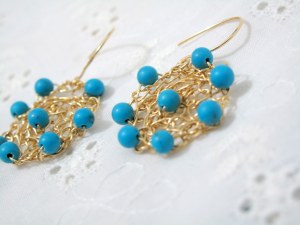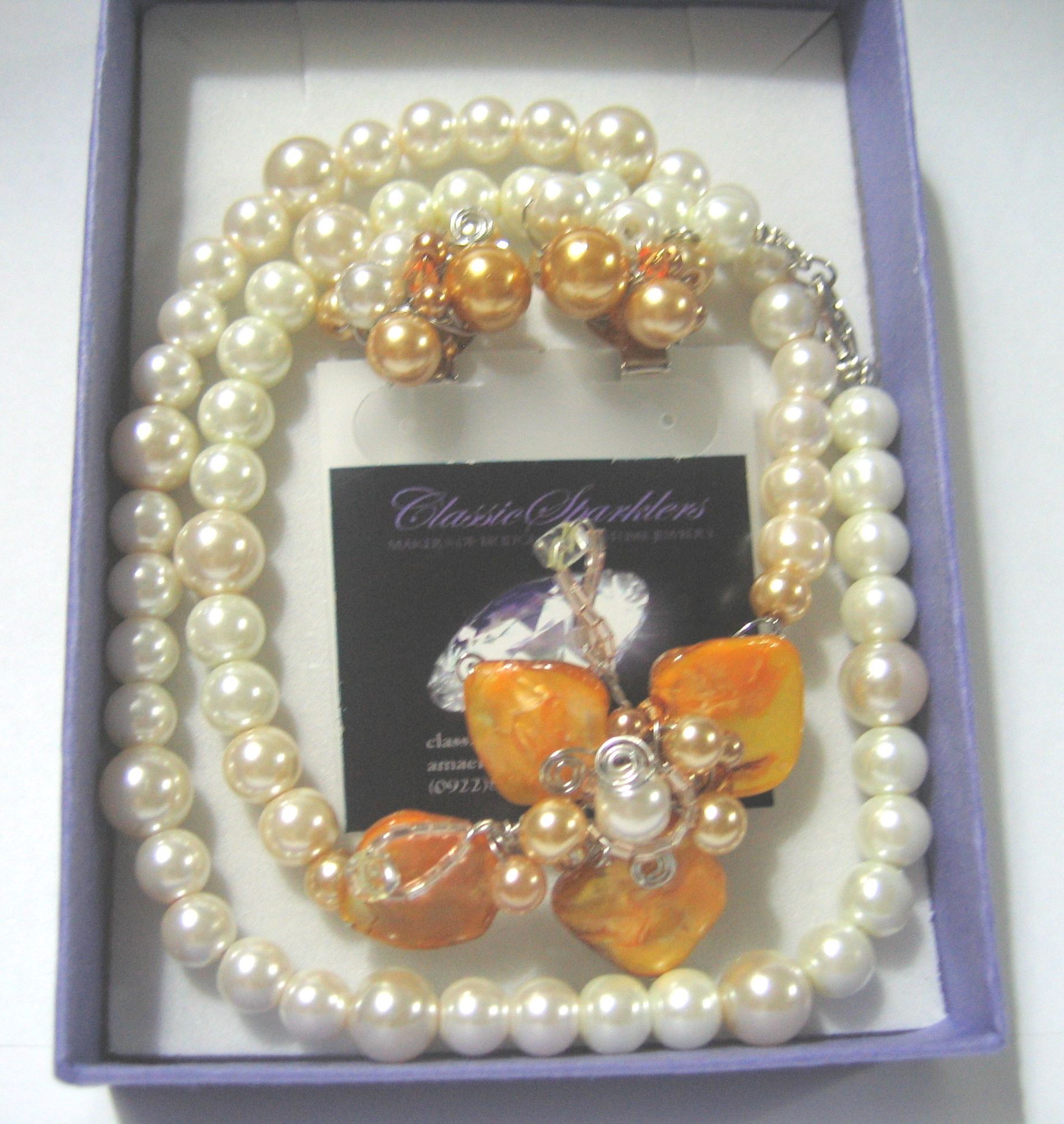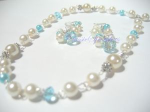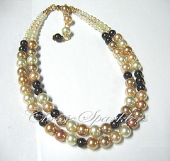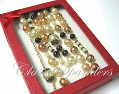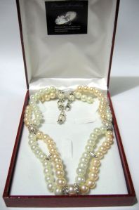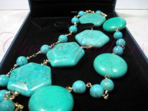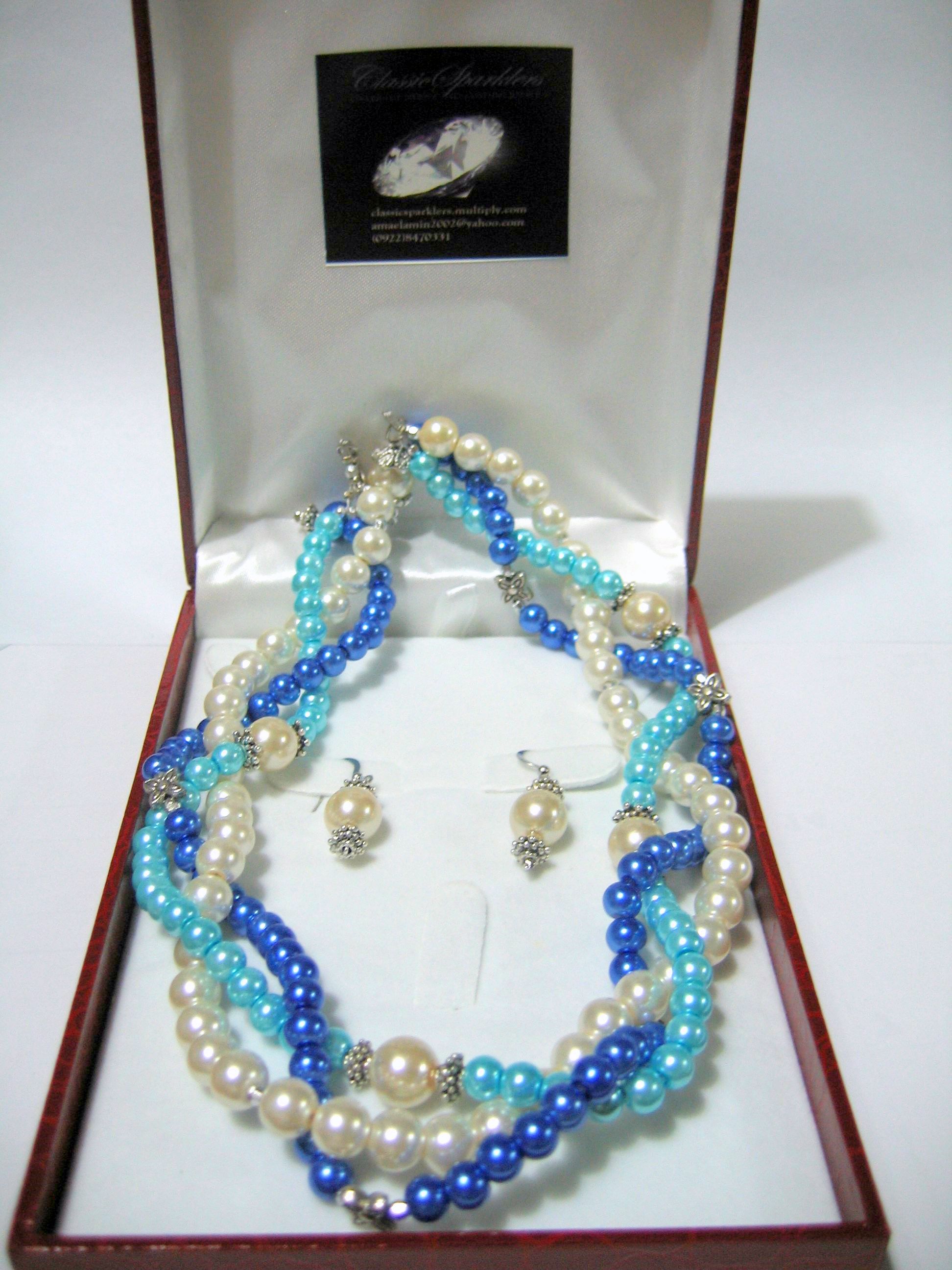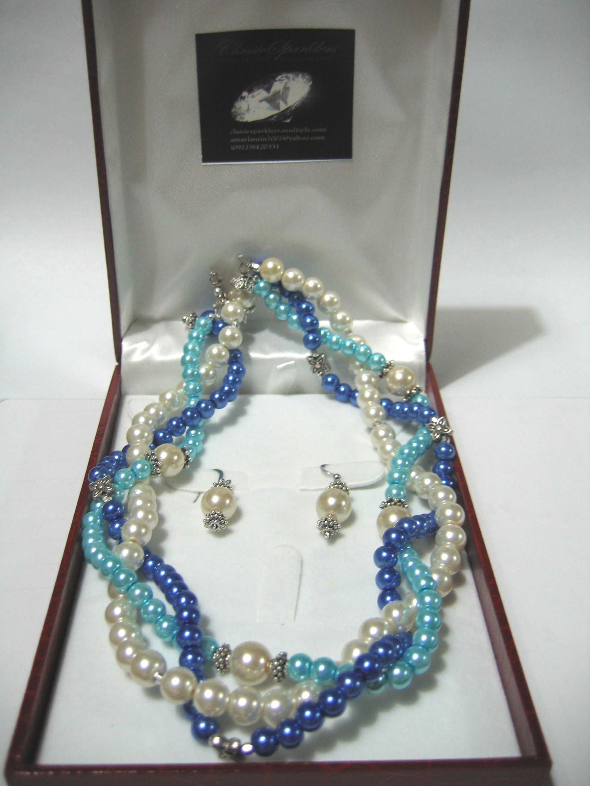 For her wedding coordinators, she asked me to create something in their favorite colors. I decided on a necklace. One was a detachable triple strand necklace, the other was a detachable double strand. Again, I can’t find the photos.